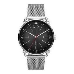 Armani Austausch Herrenuhr nur Zeit. Uhr mit rundem Gehäuse aus silberfarbenem Edelstahl mit poliertem und satiniertem Finish.