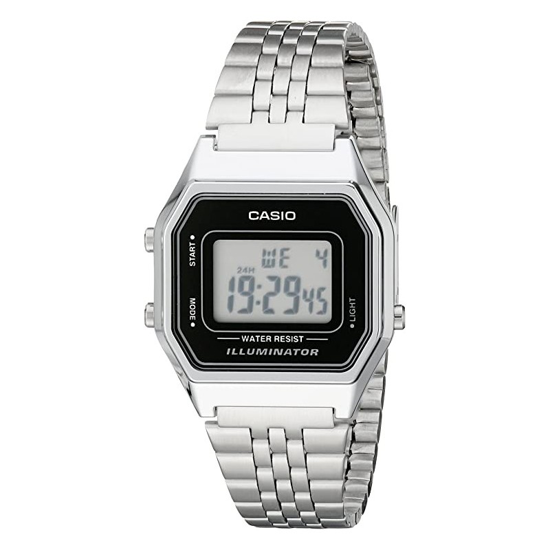 Digitale Damenarmbanduhr von Casio mit Quarzwerk, Chronographenfunktion und Datumsanzeige. Achteckiges Edelstahlgehäuse in Silberoptik, 28 mm Durchmesser. Analog-digitales Zifferblatt mit Stunden-, Minuten- und Sekundenanzeige. Automatischer Kalender (einmal eingestellt). Chronographen- und Alarmfunktion. Kunststoffglas. Edelstahlarmband in Silberoptik mit verstellbarer Faltschließe. Wasserdicht bis 5 ATM: Spritzwassergeschützt, jedoch nicht druckfest.