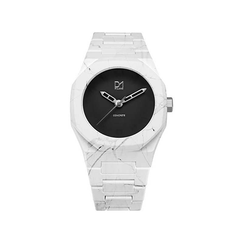 D1 Milano Unisex-Armbanduhr aus der Concrete Kollektion mit Citizen Miyota 2036 Quarzwerk und reiner Zeitanzeige. Achteckiges Gehäuse aus weißem, marmoriertem Polycarbonat, 40,5 mm Durchmesser und 10,7 mm dick, mit verschraubtem Edelstahlboden. Schwarzes analoges Zifferblatt ohne Indizes, diamantgeschliffene Zeiger, Logo auf der Oberseite, Mineralglas. Weißes, marmoriertes Polycarbonat-Armband mit Soft-Touch-Oberfläche und Druckknopf-Faltschließe. Wasserdicht bis 5 ATM: spritzwassergeschützt, jedoch nicht druckfest.