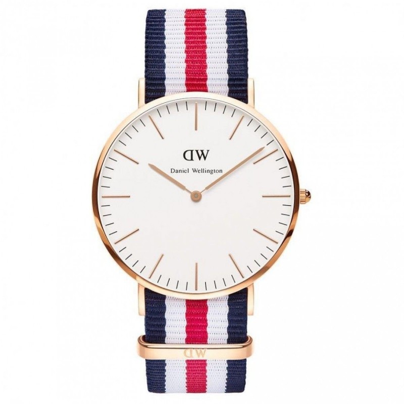 Daniel Wellington Uhr aus der Classic Collection. Uhr im Canterbury-Stil mit rundem Gehäuse von 6 mm Dicke aus roségoldenem Stahl mit einer Größe von 40 mm und Mineralglas. Das Uhrwerk ist japanischer Quarz. Das Zifferblatt ist eierschalenweiß, die Indizes sind Stäbchen. Das Armband ist dünn Vintage Blau Weiß Und Rot Mehrfarbige Streifen In Nylongewebe Nylon Mit Schnalle Mit Logo. Jede Daniel Wellington Uhr hat ein austauschbares Armband mit anderen Farben