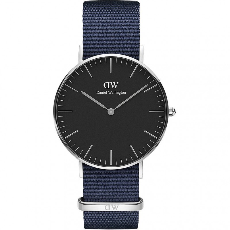 Die einzige Zeituhr für Damen von Daniel Wellington aus der Bayswater-Kollektion. Uhr mit dünnem silbernem Gehäuse von 36 mm Durchmesser. Modell mit schwarzem Zifferblatt mit silbernen Farbstäben. Nachtblaue NATO-Armbanduhr mit 18 mm breiter Schleife. Uhr mit japanischem Quarzwerk und Wasserdichtigkeit bis 3 Atm