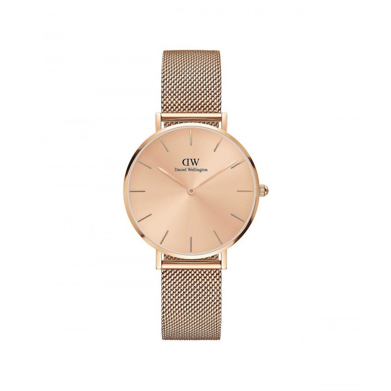 Daniel Wellington Damenarmbanduhr aus der Petite-Kollektion mit Quarzwerk und Zeitfunktion. Rundes roségoldfarbenes Edelstahlgehäuse mit einem Durchmesser von 32 mm und einer Dicke von 6 mm, Gehäuseboden mit Schnappverschluss, analoges roséfarbenes Zifferblatt mit Strichindizes, Mineralglas. Edelstahlarmband mit roségoldfarbener PVD-Behandlung in Mailänder Mesh 14 mm breit mit verstellbarem Schnappverschluss und Sicherheitsverschluss, 3 ATM wasserdicht: beständig gegen Wasserspritzer, aber nicht unter Druck.