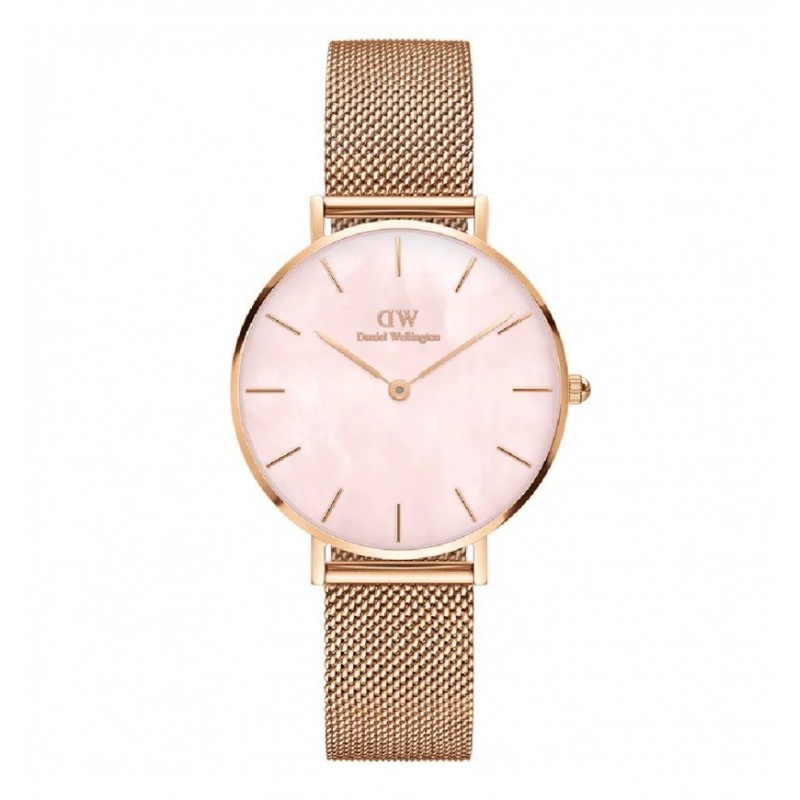 Daniel Wellington Damenarmbanduhr aus der Petite Kollektion mit GL22 Quarzwerk und reiner Zeitanzeige. Rundes, roségoldplattiertes Edelstahlgehäuse, 32 mm Durchmesser und 6 mm Dicke. Rosa Perlmutt-Zifferblatt mit analoger Anzeige, roségoldfarbenen Strichindizes und Logo-Logo, Mineralglas. Roségoldfarbenes Milanaise-Armband aus Edelstahl mit Schiebefaltschließe und Sicherheitsverschluss, wasserdicht bis 3 ATM: spritzwassergeschützt, jedoch nicht druckfest.