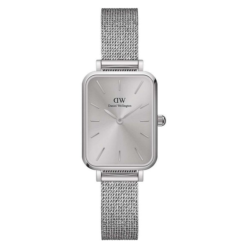 Daniel Wellington Damenarmbanduhr aus der Quadro-Kollektion mit Quarzwerk und reiner Zeitanzeige. Rechteckiges, silberfarbenes Edelstahlgehäuse, 26 mm Durchmesser und 6 mm dick. Silbernes Zifferblatt mit analoger Anzeige, Strichindizes und Logo oben, Mineralglas. Silberfarbenes Edelstahl-Mesh-Armband mit verstellbarer Faltschließe, wasserdicht bis 3 ATM: spritzwassergeschützt, aber nicht druckfest.