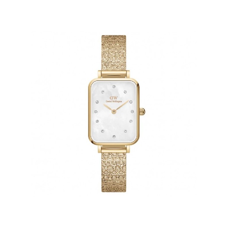 Daniel Wellington Damenarmbanduhr aus der Quadro Lumine Kollektion mit GL22 Quarzwerk und reiner Zeitanzeige. Rechteckiges, goldfarbenes Edelstahlgehäuse (26 mm Durchmesser, 6 mm dick) mit Schnappdeckel. Weißes Perlmuttzifferblatt mit analoger Anzeige, weißen Kristallindizes, Logo oben, Mineralglas. Goldfarbenes Milanaise-Armband aus Edelstahl mit verstellbarer Faltschließe und Sicherheitsverschluss. Wasserdicht bis 3 ATM (spritzwassergeschützt, nicht druckfest).