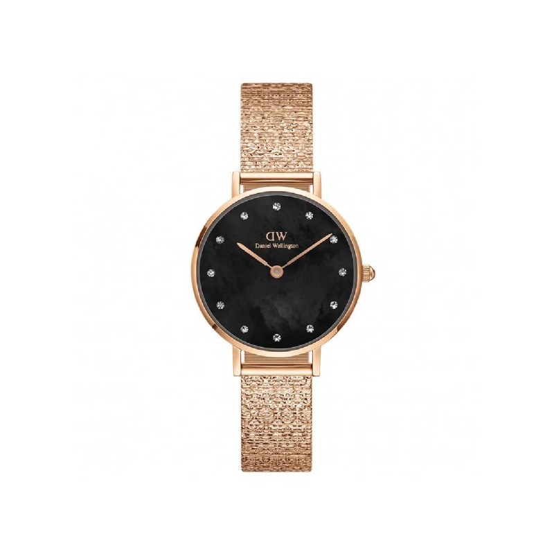 Daniel Wellington Damenarmbanduhr aus der Lumine Kollektion mit GL22 Quarzwerk und reiner Zeitanzeige. Rundes, roségoldfarbenes Edelstahlgehäuse (28 mm Durchmesser, 6 mm dick) mit Schnappdeckel. Schwarzes Perlmuttzifferblatt mit weißen Kristallindizes, Logo oben, Mineralglas. Roségoldfarbenes Edelstahl-Mesharmband mit verstellbarer Faltschließe und Sicherheitsverschluss. Wasserdicht bis 3 ATM: Spritzwassergeschützt, jedoch nicht druckfest.