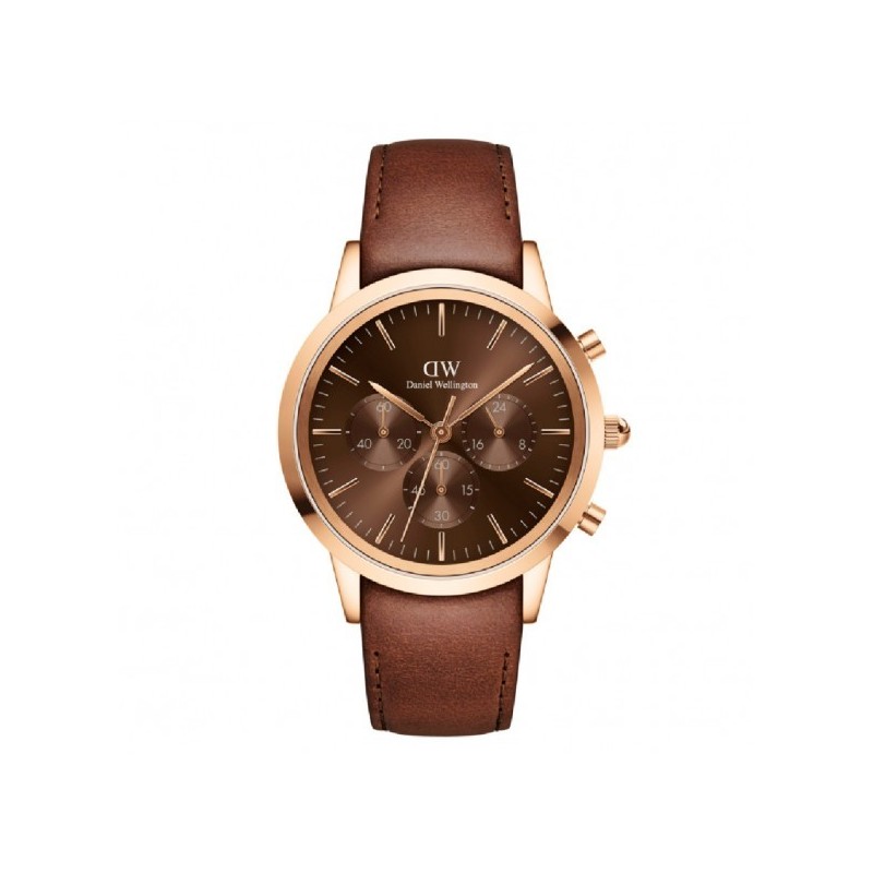 Daniel Wellington Herrenarmbanduhr aus der Iconic Chronograph Kollektion mit Quarzwerk und Chronographenfunktion. Rundes, roségoldfarbenes Edelstahlgehäuse (42 mm Durchmesser, 9 mm dick) mit Schnappverschluss am Gehäuseboden. Braunes analoges Zifferblatt mit Strichindizes, Logo oben, Mineralglas. Braunes Lederarmband mit Dornschließe. Wasserdicht bis 5 ATM: spritzwassergeschützt, aber nicht druckfest.