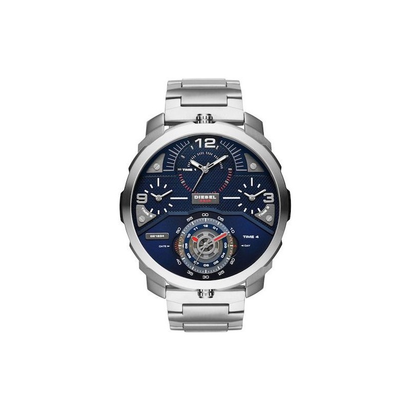 Diesel-Herrenarmbanduhr aus der Machinus-Kollektion mit Quarzwerk und Nur-Zeit-Funktion mit Datum. Rundes, silberfarbenes Edelstahlgehäuse mit einem Durchmesser von 60 mm, blaues Analogzifferblatt mit kugelförmigen Hilfszifferblättern und arabischen Ziffern als Stundenmarkierungen bei 12, 9 und 3 Uhr, Logo im Mittelteil, Mineralglas. Silberfarbenes Edelstahlarmband mit Faltschließe, wasserdicht bis 5 ATM: beständig gegen Spritzwasser, aber nicht unter Druck.