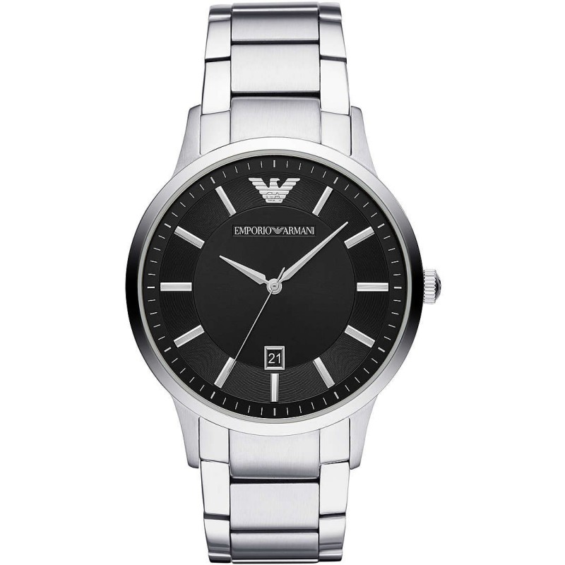 Emporio Armani Herrenuhr Nur Zeit. Uhr mit rundem Gehäuse aus Edelstahl mit gemischter Oberfläche in Silberfarbe. Die Gehäusegröße beträgt 43 mm und die Dicke beträgt 8 mm. Edelstahlring mit glänzendem Silberfinish. Edelstahlarmband mit gemischter Silberfarbe und Faltschließe. Schwarzes Zifferblatt mit transparentem Glas. Entfernung von Anse: 22 mm. Die Wasserfestigkeit beträgt 5 Atm. Uhrwerk: Quarz / 3 Kugeln mit Datum.