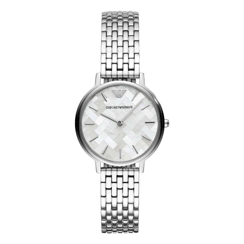 Nur Damenuhr von Emporio Armani. Modell mit rundem Gehäuse aus Edelstahl in Silberfarbe und gemischtem Finish. Gehäuse mit einem Durchmesser von 32 mm und einer Dicke von 6 mm.Das Zifferblatt ist aus Perlmuttfarbe mit transparentem Glas und Stabindex. Das Armband hat ein silberfarbenes Edelstahlarmband mit polierter Oberfläche und einer Faltschließe. Der Abstand der Anse beträgt 14 mm. Das Uhrwerk ist Quarz mit 2 Kugeln und 3 ATM Wasserdichtigkeit