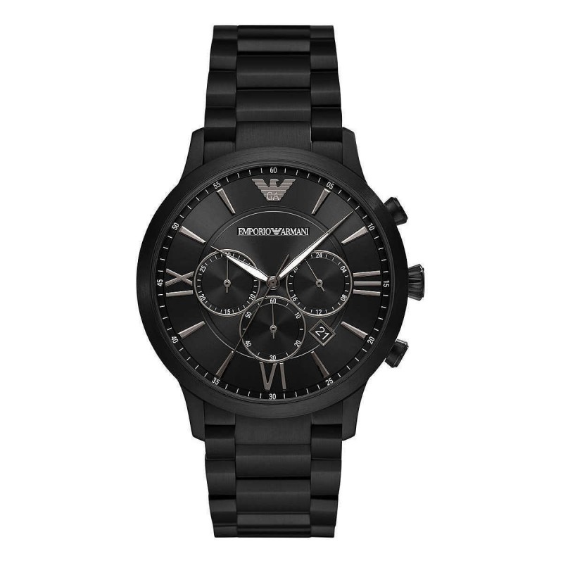 Chronographenuhr aus der Herrenkollektion von Emporio Armani. Gehäusefarbe: schwarz; Zifferblattfarbe: schwarz; Armbandfarbe: schwarz. Gehäuse mit 43 mm Durchmesser aus Edelstahl 316L mit schwarzer PVD-Beschichtung und schwarzem Zifferblatt mit gemischten silberfarbenen Indizes und Datum. Anstoßbreite 22 mm. Mineralglas. Armband aus Edelstahl 316L mit schwarzer PVD-Behandlung und Faltschließe mit Sicherheitsverschluss. Quarzwerk. 5 ATM wasserdichte wasserdichte Bewertung