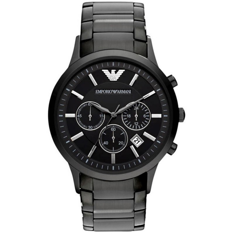 Emporio Armani Herren-Chronograph aus der Renato-Kollektion, 43 mm Durchmesser und 11 mm dickes Edelstahlgehäuse mit schwarzer IP-Behandlung, rundes schwarzes analoges Zifferblatt mit silberfarbenen Stickindizes, Datumsfunktion, Mineralglas, Stahlarmband Edelstahl mit schwarzer IP-Behandlung mit verdecktem Verschluss mit Sicherheitsverschluss, Quarzwerk mit Batteriebetrieb, Wasserdichtigkeit 5 ATM