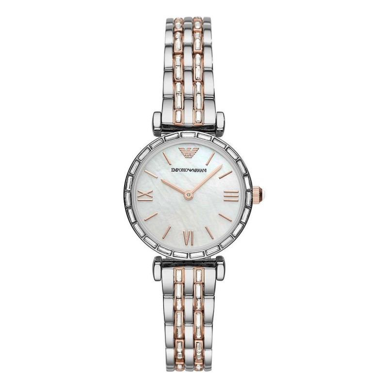 Emporio Armani Damenarmbanduhr aus der Gianni T-Bar-Kollektion mit Quarzwerk und Nur-Zeit-Funktion. Silberfarbenes Edelstahlgehäuse, umgeben von weißen Kristallen im Baguetteschliff mit 28 mm Durchmesser und 7 mm Dicke, analoges Perlmuttzifferblatt mit gemischten roségoldfarbenen Stabindizes und römischen Ziffern, Logo auf der Oberseite, Mineralglas. Zweifarbiges Edelstahlarmband aus Silber und Roségold mit weißen Kristallen im Baguetteschliff, Faltschließe mit Drückern, 3 ATM wasserdicht: beständig gegen Spritzwasser, aber nicht unter Druck.