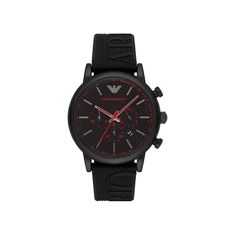 ShippingDie Herrenuhr Emporio Armani hat ein Stahlgehäuse und ein Armband aus synthetischem Material, ein Quarzwerk und ist schwarz, rot und silber. Das Gehäuse misst 4,5 cm und verfügt über eine analoge Anzeige mit Datumsfenster. Die Uhr ist wasserdicht bis 5 atm.