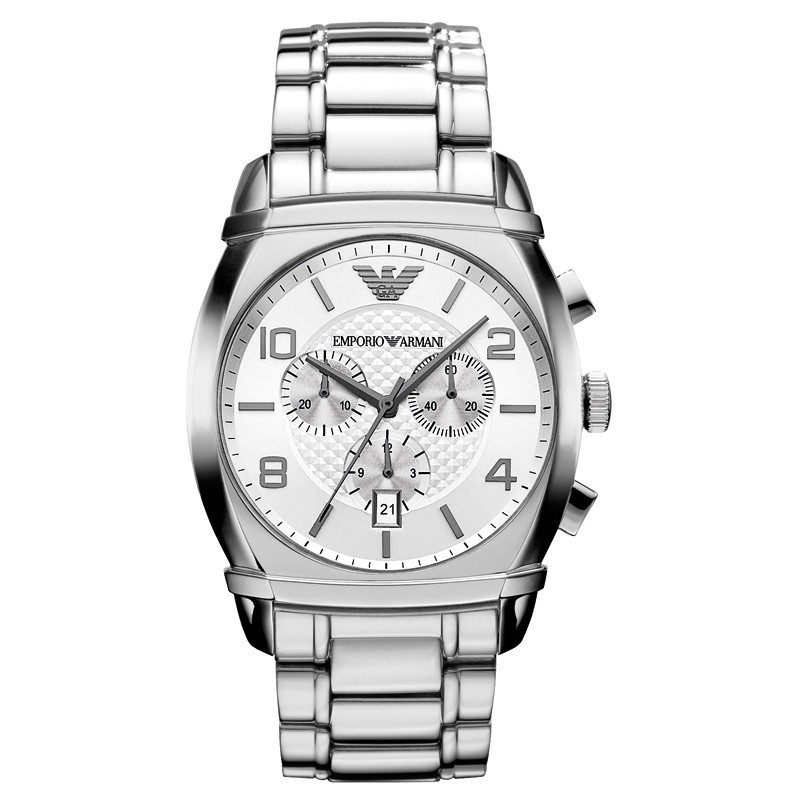 Lässige Emporio Armani Armbanduhr, Herrenchronograph mit Quarzwerk, Edelstahlgehäuse mit 42 mm Durchmesser, silbernem Zifferblatt, Mineralglas und silberfarbenem Edelstahlarmband.