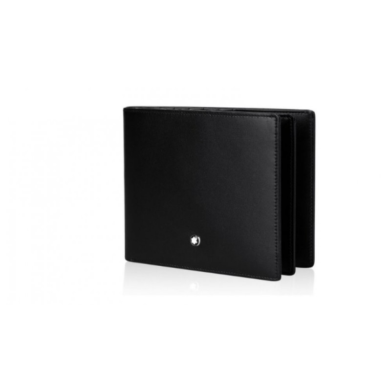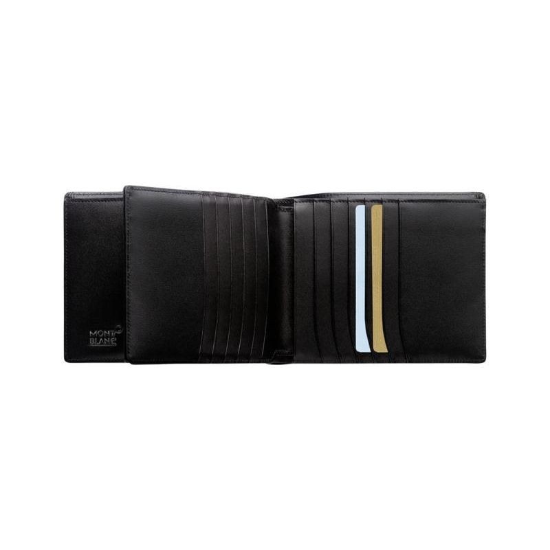 Die Meisterstück Lederbrieftasche 24 Fächer aus vollnarbigem Rindsleder europäischer Herkunft, Jacquardfutter mit Montblanc Marke und Emblem mit palladiumbeschichtetem Ring, hat 24 Fächer für Kreditkarten, 2 Fächer für Geldscheine und 2 Extrafächer.