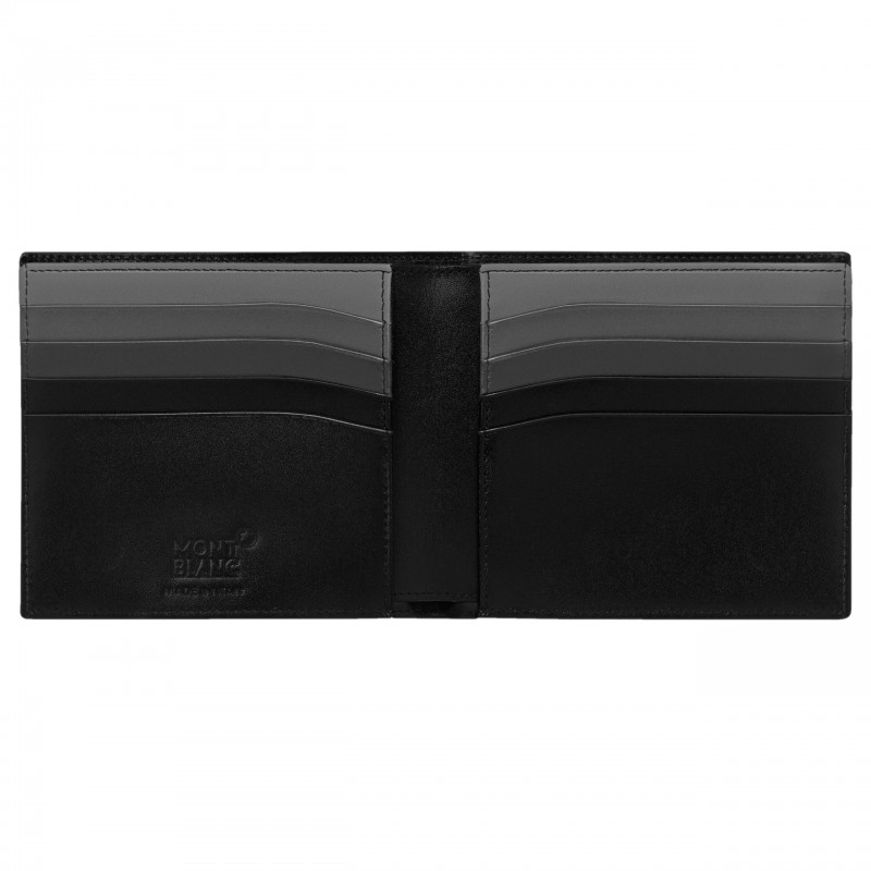 Montblanc Meisterstück Herrenbrieftasche aus schwarzem und grauem Rindsleder mit exklusivem Montblanc Glanzeffekt, chromgegerbt, durchgefärbt. Jacquard-Futter mit Montblanc Logo. Montblanc Emblem mit palladiertem Ring. Sie besteht aus 8 Kreditkartenfächern, 2 Geldscheinfächern und 2 Extrafächern. Seine schwarze Lederpolsterung außen und seine Kreditkartenfächer in verschiedenen Grautönen innen. Die Abmessungen entsprechen 10 x 105 x 95 mm.