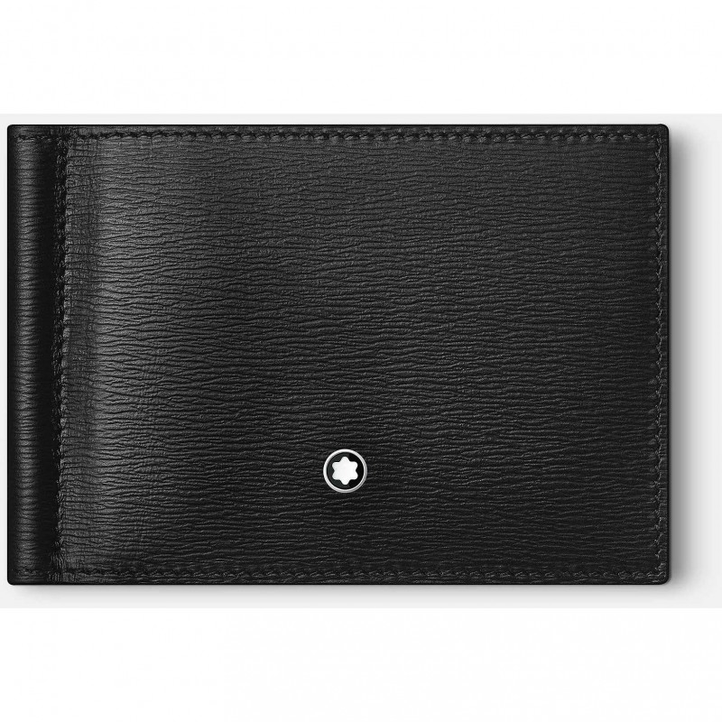 Meisterstück 4810 Geldbörse mit Mont Blanc Herren-Geldscheinklammer aus weichem, schwarzem, umweltfreundlichem, vollnarbigem Rindsleder, bedruckt mit markanter Metallecke in gebürstetem Palladium-Finish , chromgegerbt, durchgefärbt. Die Geldbörse verfügt über 2 Vordertaschen, 4 Kreditkartenfächer, 2 Fächer für Geldscheine, ein Münzfach mit Überschlag und 3 Extrafächern. Außerdem enthält es in den Kreditkartenfächern ein Futter, das RFID blockiert. Die Maße entsprechen 115 x 20 x 100 mm