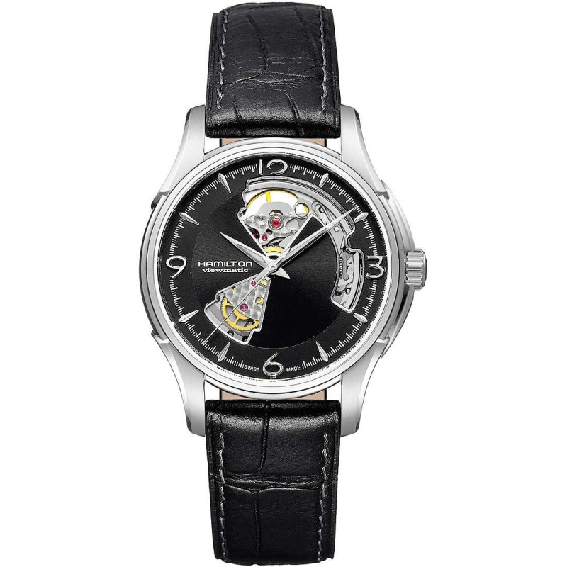 Hamilton Mechanische Herrenuhr aus der Jazzmaster Collection, Modell: Open Heart. Uhr mit 40 mm Durchmesser Stahlgehäuse, 10,80 mm Höhe und schwarzem Zifferblatt, schwarzes Kalbslederarmband mit Dornschließe. Glas: Saphir. Kaliber: C07.601 und Gangreserve von 80H. Der Wasserwiderstand beträgt 5 atm und die Bewegung ist automatisch.
