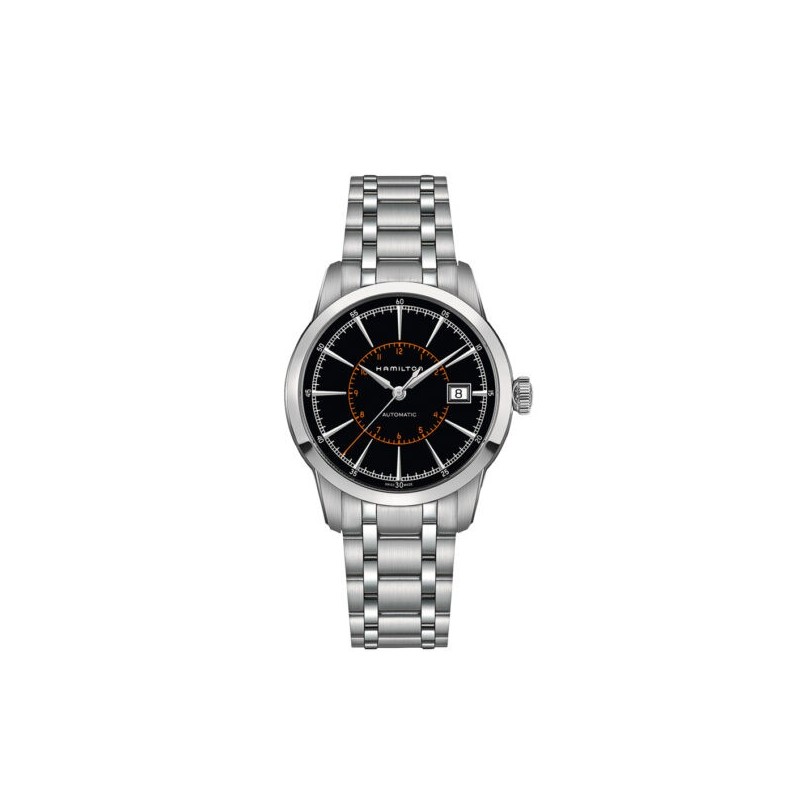 Hamilton mechanische Herrenuhr aus der American Classic Kollektion der Railroad Line. Uhr mit silberfarbenem Edelstahlgehäuse mit 40 mm Durchmesser, 11,35 mm Höhe, analoges rundes schwarzes Zifferblatt mit orangefarbenen Details und silberfarbenen Strichindizes, Datumsfunktion, kratzfestes Saphirglas, Lederarmband silberfarben Edelstahl mit Faltschließe. Kaliber: c07. 611 und 80h Gangreserve. Die Wasserdichtigkeit beträgt 5 ATM, und das Uhrwerk ist ein in der Schweiz hergestelltes, zertifiziertes Automatikwerk.