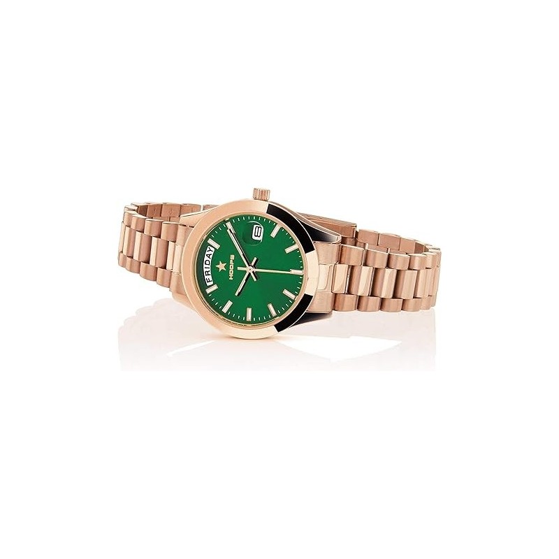 Hoops Damenuhr aus der Luxury Day Date Gold Kollektion. Rundes Metallgehäuse (33 mm Durchmesser), Indizes, Datumsanzeige und Wochentagsanzeige. Dieses Modell verfügt über ein Metallarmband und ein Myota-Uhrwerk. Die Uhr ist wasserdicht bis 2 ATM.
