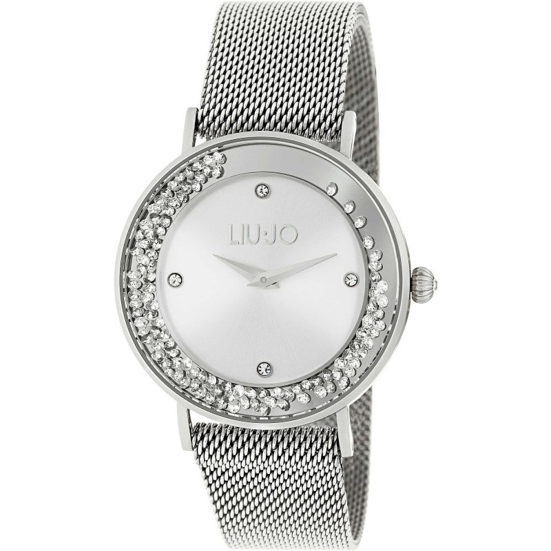 Time Only Uhr aus der Liu Jo Dancing Slim Damenkollektion. Gehäusefarbe: silber; Zifferblattfarbe: silber; Armbandfarbe: Silber. Gehäuse mit 36 mm Durchmesser aus Edelstahl 316L und Lünette mit beweglichen Kristallen. Mineralglas. Milanese Mesh-Armband aus Edelstahl 316L mit Magnetverschluss. Miyota Quarzwerk. Wasserdichtigkeitsklasse (WR) 3 ATM: beständig gegen Spritzwasser und Regen, jedoch nicht unter Druck.