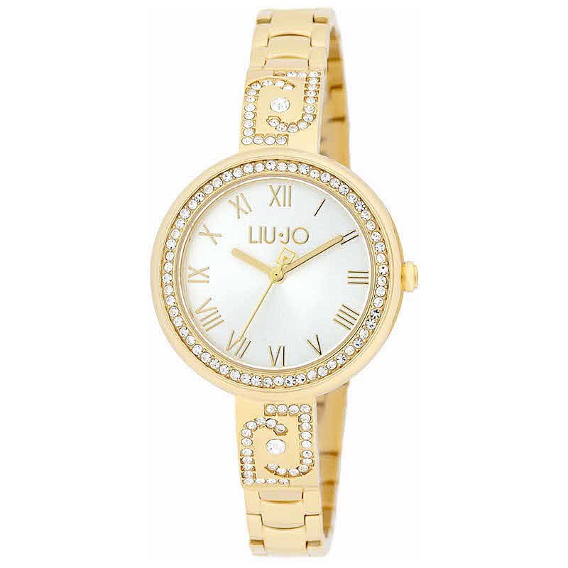 Damenuhr mit Quarzwerk Miyota 2035 und Nur-Zeit- Funktion. Rundes Gehäuse aus hypoallergenem Stahl mit goldenem Finish mit einem Durchmesser von 32 mm . Lünette mit weißen Kristallen. Silbernes analoges Zifferblatt mit Logo oben und römischen Ziffernindizes. Gliederarmband aus goldfarbenem hypoallergenem Stahl. Knopfverschluss. Wasserdicht bis 30 Meter Tiefe. Es gehört zur Nouvelle-Kollektion.