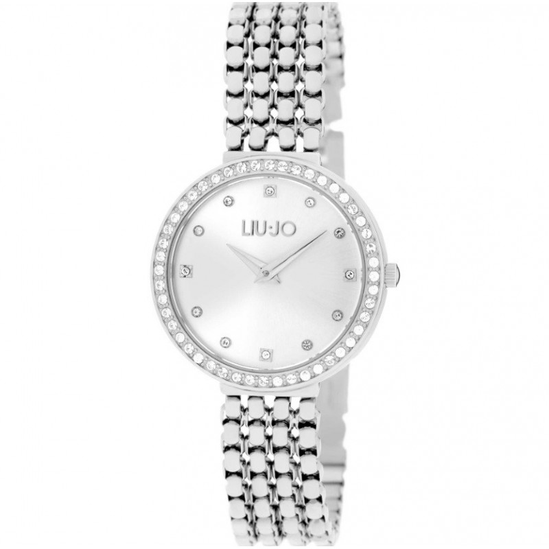 Liu Jo Damenarmbanduhr aus der Chains Clear Kollektion mit Miyota Cal Quarzwerk. VJ20 und Zeit funktionieren nur. Silberfarbenes Edelstahlgehäuse mit 28 mm Durchmesser, mit weißen Kristallen verzierte Lünette, silberfarbenes analoges Zifferblatt mit Steinindizes, Mineralglas. Silberfarbenes Edelstahl-Mesh-Armband mit Faltschließe, 3 ATM wasserdicht: Resistent gegen Spritzwasser, aber nicht unter Druck.