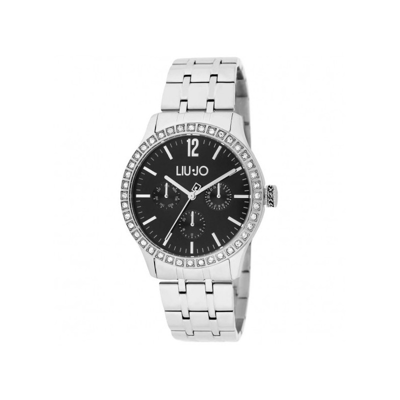 Liu Jo Damen-Chronographenarmbanduhr aus der Magnifique-Kollektion mit Miyota-Quarzwerk Kal. 6p29. Silberfarbenes Edelstahlgehäuse mit 38 mm Durchmesser, Boden und Krone mit Druckverschluss, mit weißen Kristallen verzierte Lünette. Schwarzes analoges Zifferblatt mit Strichindizes und arabischen Ziffern bei 12. Datum mit Monats- und Wochentag, Chronographenfunktion, Mineralglas. Silberfarbenes Edelstahlarmband mit Faltschließe, 3 ATM wasserdicht: beständig gegen Spritzwasser, aber nicht unter Druck.