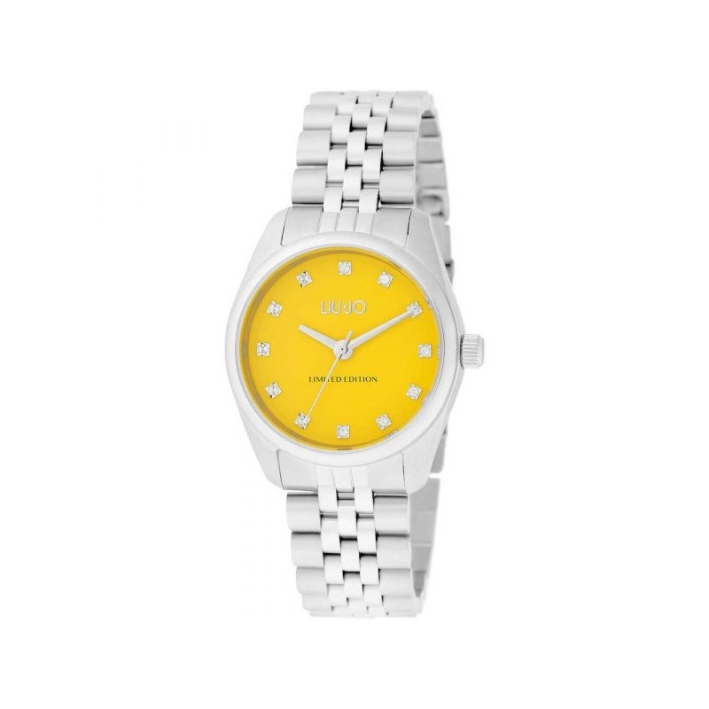 Liu Jo Damen-Time-Only-Armbanduhr aus der Coolness-Kollektion mit Miyota-Quarzwerk Cal. 2036. Silberfarbenes Edelstahlgehäuse mit 35 mm Durchmesser, gelbes analoges Zifferblatt mit Steinindizes und Logo auf der Oberseite, Mineralglas. Silberfarbenes Edelstahlarmband mit Faltschließe, 5 ATM wasserdicht: beständig gegen Spritzwasser, aber nicht unter Druck.
