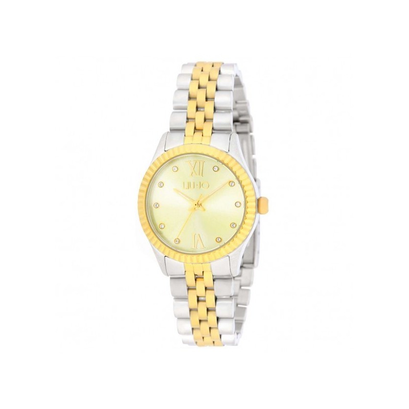 Liu Jo Damenarmbanduhr aus der Tiny-Kollektion mit Miyota 2035 Quarzwerk und reiner Zeitanzeige. Rundes, silberfarbenes Edelstahlgehäuse mit 30 mm Durchmesser. Goldfarbene, gerändelte Lünette.