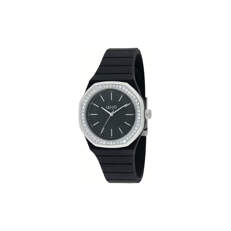 Liu Jo Damenarmbanduhr aus der Yacht Lady Kollektion. Mit Quarzwerk und reiner Zeitanzeige. Achteckiges Edelstahlgehäuse (35 mm) in Silberoptik, verziert mit weißen Kristallen. Rundes schwarzes Zifferblatt mit silberfarbenen Strichindizes, Logo oben, Mineralglas. Schwarzes Silikonarmband mit Dornschließe, wasserdicht bis 5 ATM: spritzwassergeschützt, aber nicht druckfest.
