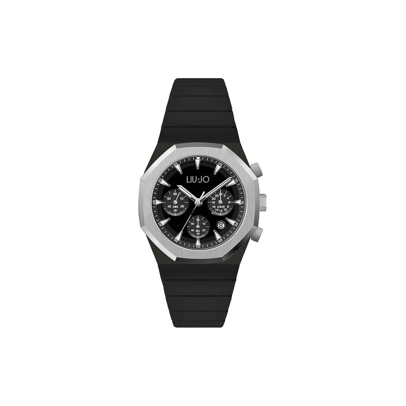 Liu Jo Herrenarmbanduhr aus der Yacht Crono Kollektion mit Quarzwerk und Chronographenfunktion mit Datumsanzeige. Achteckiges, silberfarbenes Edelstahlgehäuse, 42 mm Durchmesser. Rundes, schwarzes Zifferblatt mit silberfarbenen Strichindizes, Datumsanzeige zwischen 4 und 5 Uhr, Logo oben, Mineralglas. Schwarzes Silikonarmband mit Dornschließe, wasserdicht bis 3 ATM: spritzwassergeschützt, aber nicht druckfest.