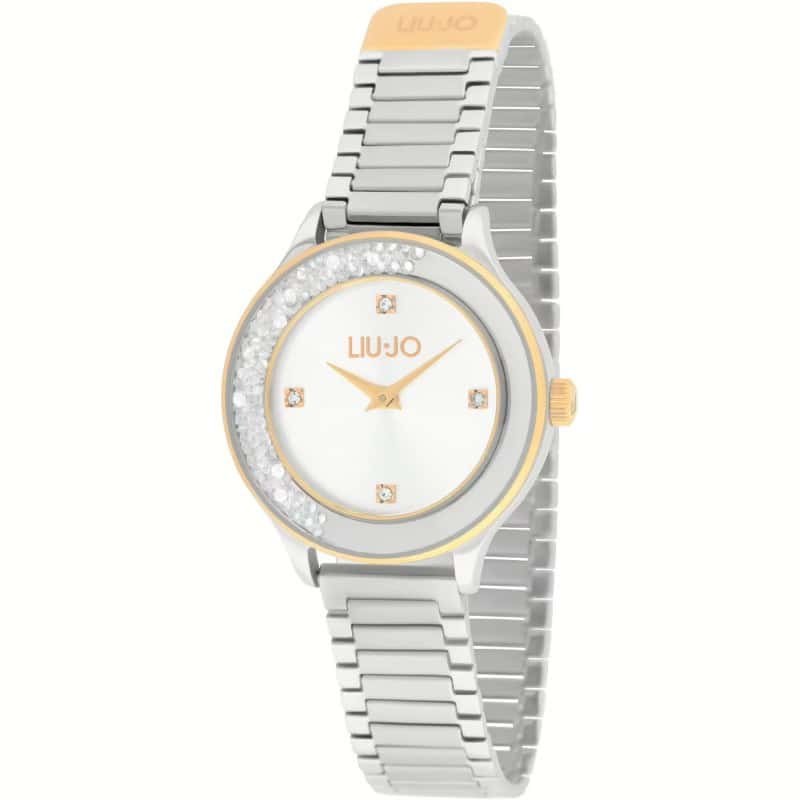 Liu Jo Damenarmbanduhr aus der Dancing Shine Kollektion mit Quarzwerk und reiner Zeitanzeige. Rundes, silberfarbenes Edelstahlgehäuse mit einem Durchmesser von 32,5 mm. Goldfarbene Lünette mit losen, weißen Kristallen, die sich den Bewegungen des Handgelenks anpassen. Weißes analoges Zifferblatt mit Kristallindizes, Logo an der Seite und Mineralglas. Silberfarbenes Edelstahlarmband mit Magnetverschluss. Wasserdicht bis 3 ATM: spritzwassergeschützt, aber nicht druckfest.