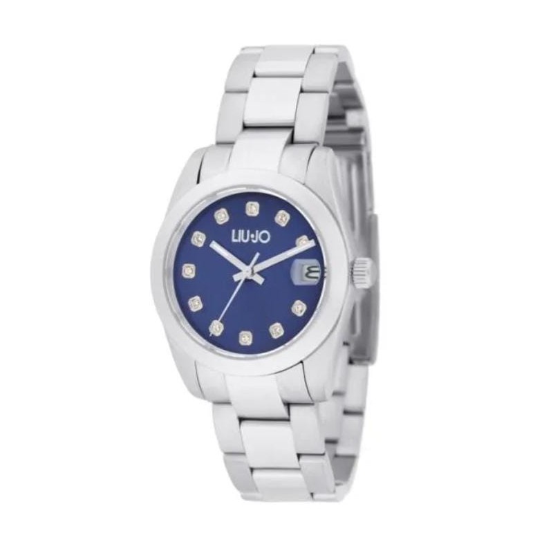 Liu Jo Damenarmbanduhr aus der Juniper-Kollektion mit Quarzwerk und Datumsanzeige. Rundes, silberfarbenes Edelstahlgehäuse, 34 mm Durchmesser. Blaues analoges Zifferblatt mit Edelsteinindizes, Datumsanzeige bei 3 Uhr, Logo oben, Mineralglas. Silberfarbenes Edelstahlarmband mit Faltschließe, wasserdicht bis 5 ATM: spritzwassergeschützt, aber nicht druckfest.