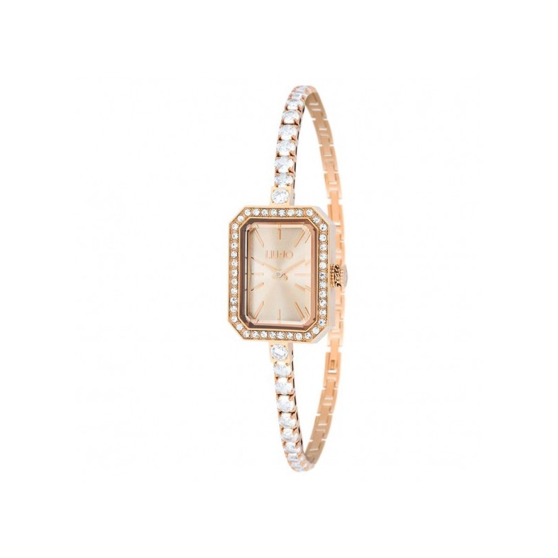 Liu Jo Damenarmbanduhr aus der Brilliant Claire Milano Kollektion mit Seiko VJ20 Quarzwerk und reiner Zeitanzeige. Quadratisches Edelstahlgehäuse in Roségold-Optik (20 x 26 mm), Lünette mit weißen Kristallen besetzt. Roségoldfarbenes Zifferblatt mit analoger Anzeige, Strichindizes, Logo oben, Mineralglas. Weißes Swarovski-Kristall-Tennisarmband mit Sicherheitsfaltschließe und herausnehmbaren roségoldfarbenen Gliedern. Wasserdicht bis 3 ATM: spritzwassergeschützt, aber nicht druckfest.