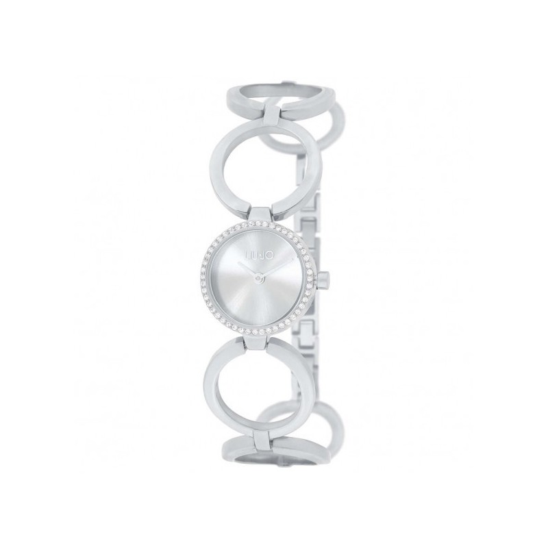 Liu Jo Damenarmbanduhr aus der Fashion Rings Kollektion mit Miyoya GL22 Quarzwerk und reiner Zeitanzeige. Rundes, silberfarbenes Edelstahlgehäuse (21,5 mm Durchmesser), Lünette mit weißen Kristallen besetzt. Silbernes analoges Zifferblatt ohne Indizes, Logo oben, Mineralglas. Silberfarbenes Edelstahlarmband mit Sicherheitsfaltschließe, wasserdicht bis 3 ATM: spritzwassergeschützt, aber nicht druckfest.