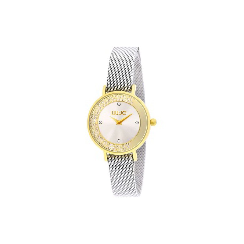 Liu Jo Damenarmbanduhr aus der Mini Dancing Slim Kollektion mit Quarzwerk und reiner Zeitanzeige. Rundes, goldfarbenes Edelstahlgehäuse (29 mm Durchmesser), Lünette mit losen, weißen Kristallen, die sich bei jeder Handgelenksbewegung bewegen. Silbernes Zifferblatt mit vier Steinindizes und goldfarbenen Details, Logo oben, Mineralglas. Silberfarbenes Edelstahlarmband im Milanaise-Stil mit Schiebefaltschließe, wasserdicht bis 3 ATM: spritzwassergeschützt, aber nicht druckfest.
