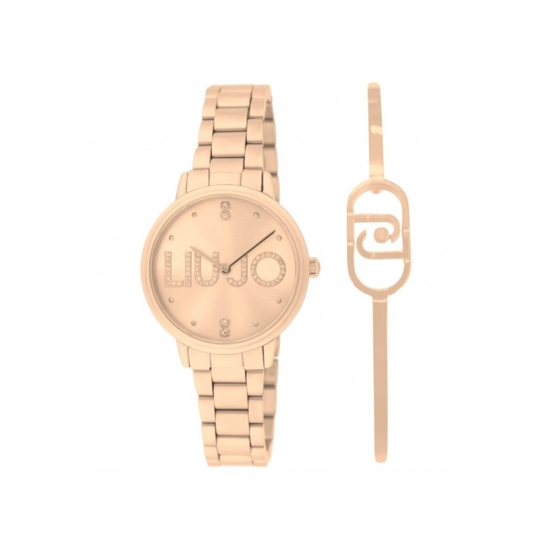 Liu Jo Damenarmbanduhr aus der Identity Kollektion mit Seiko VJ20 Quarzwerk und reiner Zeitanzeige. Rundes, roségoldfarbenes Edelstahlgehäuse mit 32 mm Durchmesser. Roségoldfarbenes Zifferblatt mit analoger Anzeige, Edelstein-Stundenmarkierungen und Edelstein-Logo in der Mitte, Mineralglas. Roségoldfarbenes Edelstahlarmband mit Druckknopf-Faltschließe, wasserdicht bis 3 ATM: spritzwassergeschützt, aber nicht druckfest. Das goldfarbene Edelstahlarmband mit Logo ist im Lieferumfang enthalten.