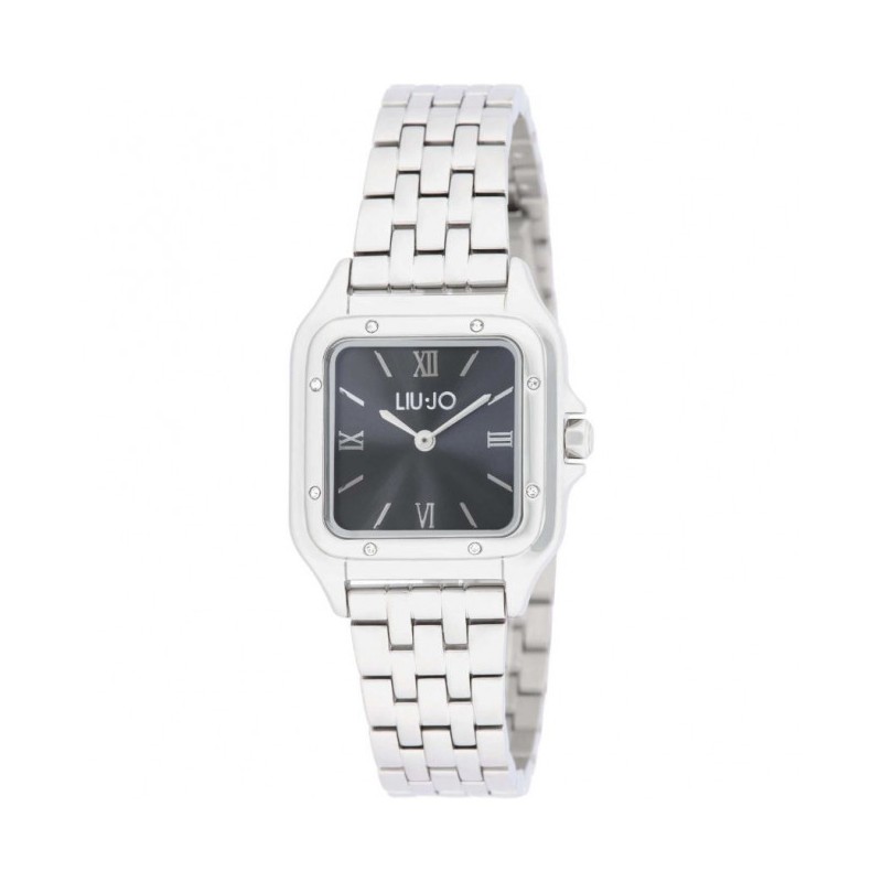 Liu Jo Damenarmbanduhr aus der Shimler Kollektion mit Miyota Kaliber VJ20 Quarzwerk und reiner Zeitanzeige. Quadratisches, silberfarbenes Edelstahlgehäuse (28 mm Durchmesser), silberfarbene Edelstahllünette mit weißen Kristallen. Schwarzes analoges Zifferblatt mit Strich- und römischen Ziffern, Logo oben, Mineralglas. Silberfarbenes Edelstahlarmband mit Druckknopf-Faltschließe, wasserdicht bis 3 ATM: spritzwassergeschützt, aber nicht druckfest.
