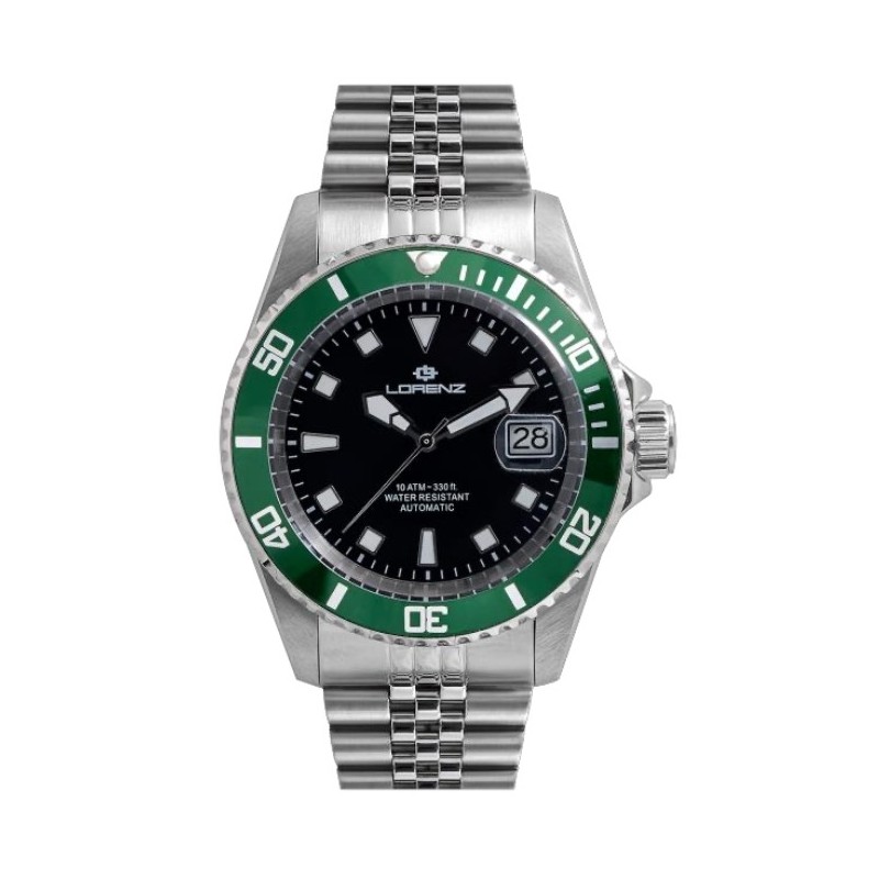 Lorenz Submariner 26121CC analoge Herren-Casual-Armbanduhr mit mechanischem Seiko NH35-Uhrwerk mit automatischem Aufzug. Edelstahlgehäuse mit 43 mm Durchmesser, 13 mm Dicke. schwarzglänzendes analoges Zifferblatt, grüne Lünette, fluoreszierende Zeiger und Indizes, Datumsfunktion durch das Vorhandensein einer Zyklopenlinse, Mineralglas. Die Lünette des Modells ist einseitig drehbar mit 120 Klicks, der Gehäuseboden ist verschraubt und aus Stahl sowie die Krone ist verschraubt mit Rändelstruktur. Das Armband ist aus silberfarbenem Jubilee-Mesh-Edelstahl mit Faltschließe und Sicherheitsverschluss, wasserdicht 10 ATM