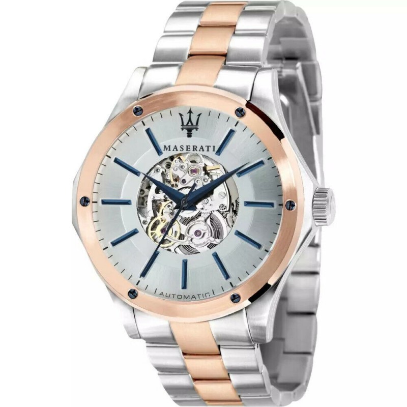 ShippingMaserati Herren-Automatikuhr aus der Circuito-Kollektion. Uhr mit Stahlgehäuse und roségoldfarbenem PVD, poliert und satiniert, mit einer Größe von 52X44 mm und einer Dicke von 11,75 mm. Uhr mit silbernem und roségoldenem Metallarmband und Faltschließe. Modell mit Mineralglas und 10 atm Wasserbeständigkeit