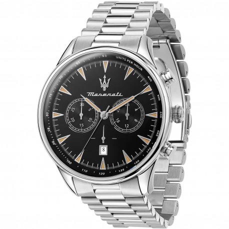 Maserati Herren-Chronograph aus der Traditionskollektion. Uhr mit schwarzem Zifferblatt und 45 mm Gehäuse. Uhr aus Stahl mit Mineralglas. Die Wasserdichtigkeit beträgt 10 atm. Die Referenz lautet r8873646004