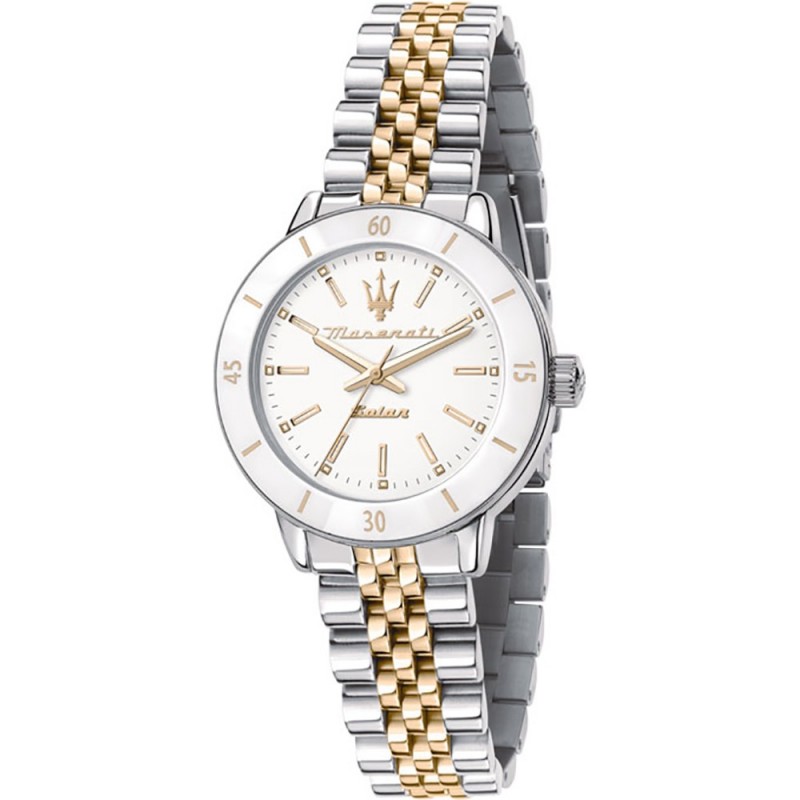 Elegante Maserati Successo Solar R8853145514 analoge Damenarmbanduhr mit solarbetriebenem Uhrwerk mit Nur-Zeit-Funktion. Silberfarbenes Edelstahlgehäuse mit 32 mm Durchmesser, silberfarbenes analoges Zifferblatt mit goldfarbenen Stabindizes, Mineralglas. Zweifarbiges Jubilee-Mesh-Armband aus Edelstahl in Silber und Gold mit Druckknopf-Faltschließe. 5 ATM wasserdicht: beständig gegen Spritzwasser, aber nicht unter Druck.