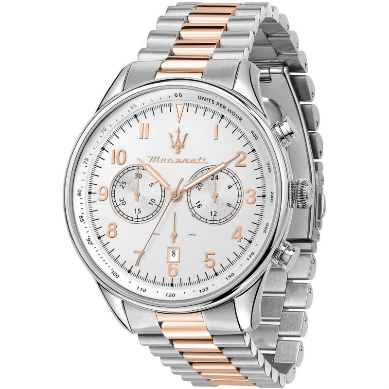 Maserati Herrenarmbanduhr aus der Kollektion Tradizione mit Miyota JS25 Quarzwerk und Chronographenfunktionen mit Datum. Rundes, silberfarbenes Edelstahlgehäuse mit poliertem Finish, 45 mm Durchmesser und 11,95 mm Dicke, verschraubte Krone, Tachymeter-Lünette, weißes analoges Zifferblatt mit roségoldfarbenen arabischen Stundenmarkierungen, Datumsanzeige bei 6 Uhr und gewölbtes Glas. Zweifarbiges Edelstahlarmband in Silber und Roségold mit Druckknopf-Faltschließe. 10 ATM wasserdicht