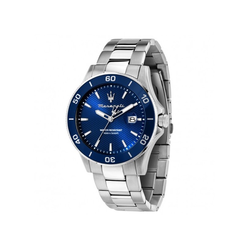 Maserati Herrenarmbanduhr aus der Competizione-Kollektion mit Miyota 2315 Quarzwerk und Nur-Zeit-Funktionen mit Datum. Rundes, silberfarbenes Edelstahlgehäuse mit einem Durchmesser von 43 mm und einer Dicke von 11,20 mm, blauer Keramiklünette, verschraubtem Gehäuseboden und verschraubter Krone, um eine höhere Wasserdichtigkeit zu gewährleisten. Blaues analoges Zifferblatt mit Strichmarkierungen, Logo bei 12 Uhr und Datumsanzeige bei 3 Uhr mit Lupe. Silberfarbenes Edelstahlarmband mit Druckknopf-Faltschließe, 10 ATM wasserdicht