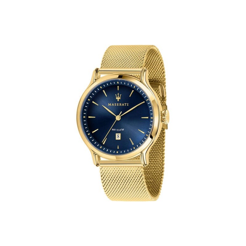 Maserati Herrenarmbanduhr aus der Epoca Kollektion mit Quarzwerk und Datumsanzeige. Rundes Edelstahlgehäuse mit goldfarbener PVD-Beschichtung, 42 mm Durchmesser und 10,90 mm Dicke, verschraubter Gehäuseboden. Blaues analoges Zifferblatt mit goldfarbenen Strichindizes, Datumsanzeige bei 6 Uhr, Mineralglas. Goldfarbenes Milanaise-Armband aus Edelstahl mit Schiebeverschluss, wasserdicht bis 10 ATM.
