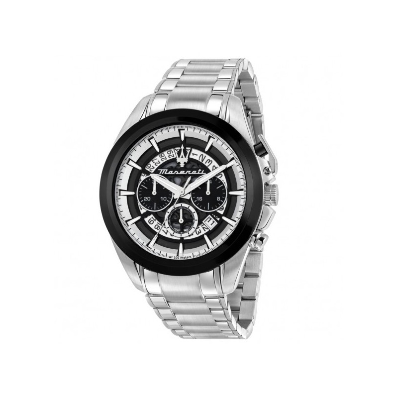 Maserati Herrenarmbanduhr aus der Traguardo Kollektion mit Miyota JS25 Quarzwerk und Chronographenfunktion mit Datumsanzeige. Rundes, silberfarbenes Edelstahlgehäuse, 45 mm Durchmesser und 12,40 mm dick. Schwarze Lünette. Verschraubte Krone und verschraubter Gehäuseboden für Wasserdichtigkeit. Analoges Zifferblatt mit Strichindizes, Logo oben und Datumsanzeige zwischen 4 und 5 Uhr. Silberfarbenes Edelstahlarmband mit Druckknopf-Faltschließe, wasserdicht bis 10 ATM.