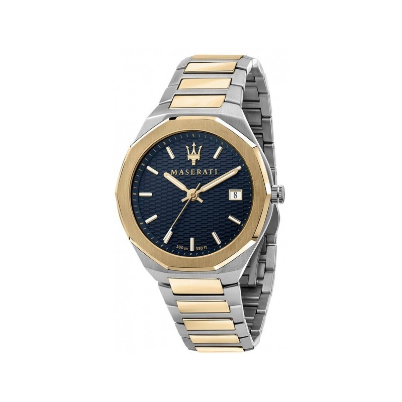 Maserati Herrenarmbanduhr aus der Stile Kollektion mit Quarzwerk und Datumsanzeige. Rundes, silberfarbenes Edelstahlgehäuse, 45 mm Durchmesser und 9,30 mm dick. Zehneckige, goldfarbene Stahllünette. Blaues analoges Zifferblatt mit goldfarbenen Strichindizes, Datumsanzeige bei 3 Uhr, Logo auf der Krone, Mineralglas. Zweifarbiges Edelstahlarmband in Silber und Gold mit Druckknopf-Faltschließe, wasserdicht bis 10 ATM.