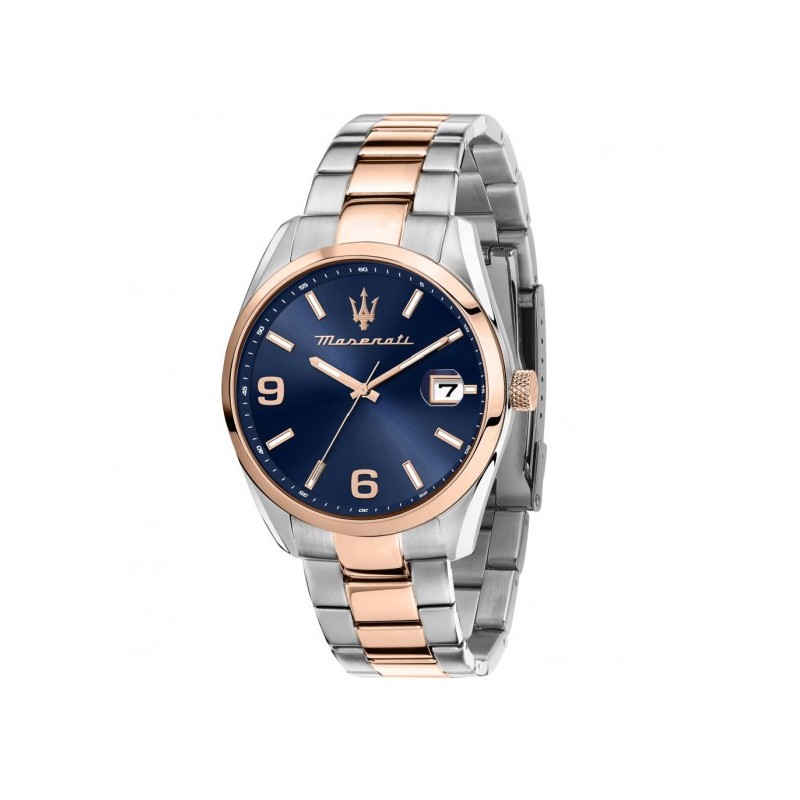 Maserati Herrenarmbanduhr aus der Attrazione Kollektion mit Miyota 2415 Quarzwerk und Datumsanzeige. Rundes, silberfarbenes Edelstahlgehäuse (43 mm Durchmesser) mit roségoldplattierter Lünette. Blaues analoges Zifferblatt mit Strichindizes und roségoldfarbenen arabischen Ziffern, Logo bei 12 Uhr und Datumsanzeige mit Lupe bei 3 Uhr. Zweifarbiges Edelstahlarmband in Silber und Roségold mit Faltschließe. Wasserdicht bis 5 ATM: spritzwassergeschützt, aber nicht druckfest.